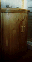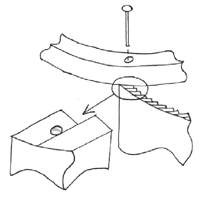 Once both doors have been satisfactorily shaped, it is time to attach them to the frame. The doors use hidden hinges, rather than ruining the shape of the overall unit by having hinges jutting out. Indeed, the hinges are very, very basic: they are long bolts. Position the door into place and then drill a hole straight down through the top frame and into the top of the door. A long bolt (4" or more) is then placed into this slot, thus attaching the door to the frame. This is repeated for the bottom of the frame/door to form a hinge at both the bottom and top of the door. Note: it is very important that the top and bottom hinges match up very, very accurately. If they do not, the door will not open smoothly. To ensure that this is done correctly, ensure that the frame is on a flat surface, and then use a plumb line from the top hole to mark the bottom hinge hole.