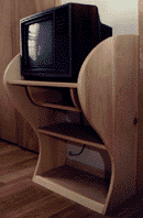 This was the problem that we came across when we decided to add a television to our bedroom. The only space we had was a 23 inch gap between two closets and putting a TV stand there looked ugly as it seemed to stick out too far. The solution was to design a top-heavy pine TV cabinet that gave the illusion of taking up less space than it actually does. The illusion is aided by the sweeping curves of the two sides, rather than utilizing straight lines.