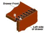 Clamp the front of the drawer and one side into the dovetail machine as follows: the left side of the drawer should be clamped under the front clamp (pointing upwards towards the template) with the inside of the drawer pointing out; the front of the drawer - again with the inside pointing out -should be clamped under the top clamp so that it butts up against the left drawer (see the second diagram). These two pieces should be staggered slightly, rather than being aligned exactly. The precise measurement will depend upon the particular dovetail machine that you are using, and this distance will be supplied with its manual. However, it should be roughly in the region of 7/16 inch.