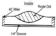Cut all the pieces together and miter the ends (construction of this box is done in the same way as for the trays, using miter joints). On the inside of the Base Box Sides and Ends, route out a niche along the bottom of each one. The niche should be 1/2" wide and 3/8" deep (see diagram on left). This niche will allow the base piece to fit snugly into the box, rather than sticking out underneath. Once this is done, glue the sides and ends together, as well as gluing the base into place and ensure that the box is square. Clamp over night to allow the glue to dry properly.