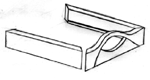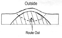 To make the actual handle shape (with the hole in the middle) use a router in the following manner. Clamp the end piece down securely, so that the inside of the piece faces upwards. Sketch out the curve shown in the above left diagram and then careful router this shape out to a depth of 1/4". Then, turn the piece upside down (so that the outside faces upwards) and route out the shape shown in the diagram on the right, again to a depth of just over 1/4". Where the two routed areas intersect, there will now be a hole, thus forming a handle. Sand the edges of these handles to form a smooth, rounded handle.