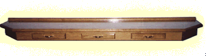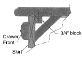 Cut the 3/4" x 3/4" stock and pre-drill clearance holes for mounting the top panel. Next mount the 3/4" x 3/4" blocks to the top inside of the skirt with glue and small nails. Then, drill clearance holes into the drawer fronts for the hardware (the drawer knobs) and into the front of the skirt. The holes in the skirt are to install and tighten up any hardware that may work loose over time and to possible change the style of the hardware to match or fit a different need. Attach the top decorative molding with glue and small nails. Cut the angle braces to the proper dimensions and attach with glue and nails. Make sure you don't cover the access holes that you drilled into the front of the skirt.