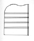 Cut the three side pieces to shape, matching the top curve on each one. Note that the "middle" side piece should be 1/2" shorter than the other two as it sits on top of the base piece, whereas the end two side pieces reach all the way to the bottom (butted up against the side of the base piece). Take one side piece and the "middle" side piece and cut the slots for the drawer bases. These slots should be 1/2" wide (and 1/8" deep), starting from 2 1/2", 5 3/4", 8 7/8" and 11 7/8" from the bottom of the middle side piece (and therefore, 3", 6 1/4", 9 3/8" and 12 3/8" from the bottom of the end side piece) -- see diagram. Then, cut a slot 1/8" from the back of each shelf (1/8" wide and deep) that will take the hardboard back (number 2). Note: for the middle side, this slot must be cut into both sides as it connects into both back one and two.