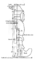 Set up the string arrangement as shown in the diagram. Thread string around each of the string screws. Glue dowel into hole in hook stem. The dowel should stick out approximately 1/4" and is used to stop the hook from falling out of the slot.